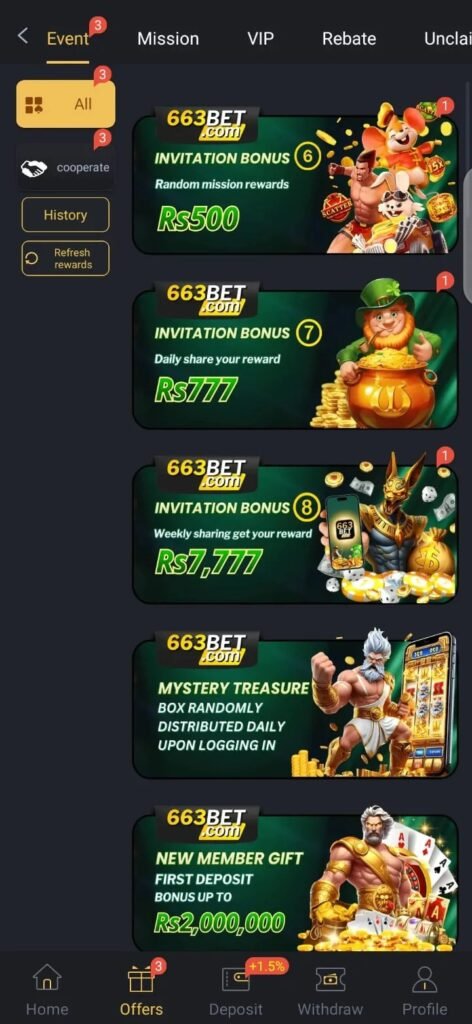 The game combines fun and financial rewards by allowing players to deposit funds, participate in games, and withdraw winnings through local payment methods like Jazz Cash or Easy paisa. Along with standard gameplay, 663Bet also offers bonuses.