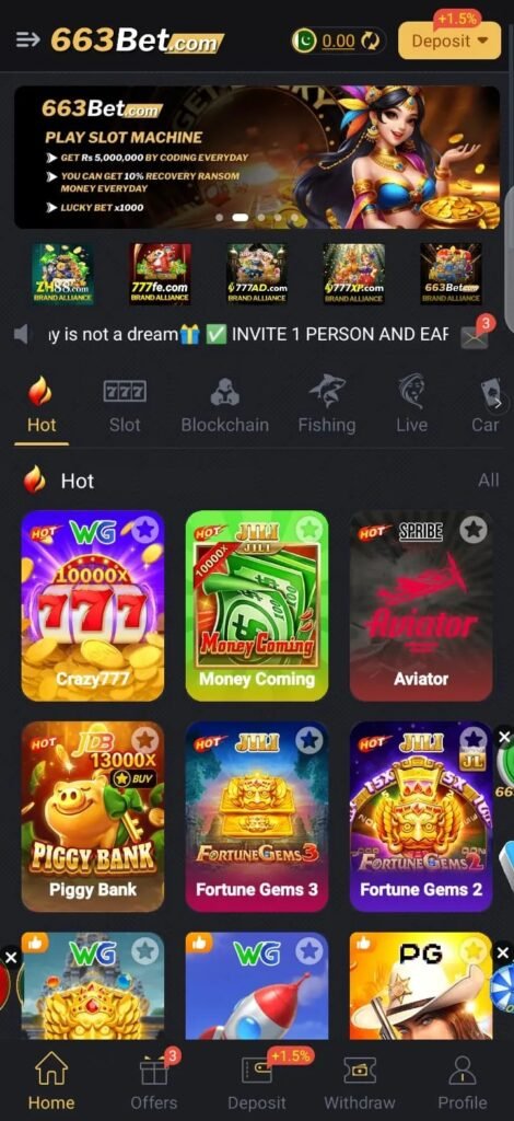 663Bet App is an online gaming and betting platform that allows users to play a variety of games and earn real money. It includes casino-style games like slots, card games, and live betting options, as well as prediction-based games where players can test their skills and luck.