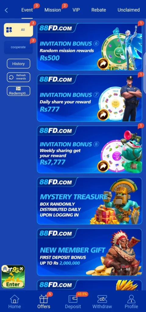 88FD Game may offer referral rewards when users invite friends to join the platform. If the invited friend registers and plays, the person who shared the referral link can receive extra coins or bonus credits.
