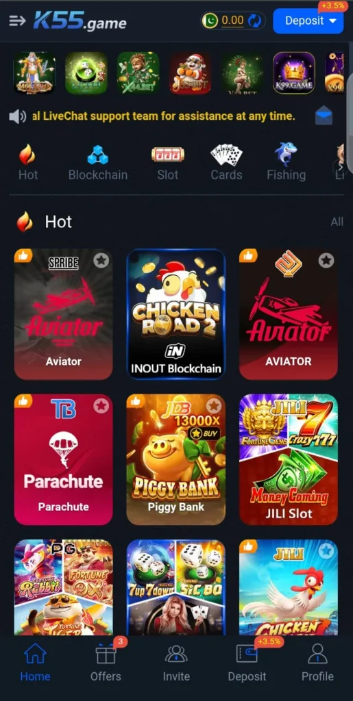 K55 App is a digital earning application that allows users to play various card and slot games to win real cash. Unlike traditional online games, this app focuses on providing genuine earning chances while keeping gameplay exciting. Players can deposit money safely and withdraw their earnings easily. The platform is accessible from smartphones and tablets, offering convenience to a wide audience. Its modern design ensures smooth navigation and enjoyable game sessions for everyone.